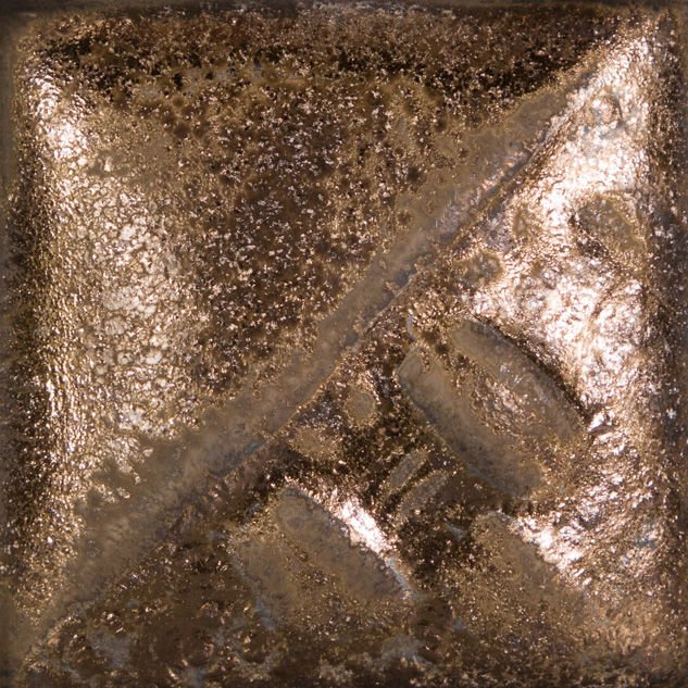 Cone 6 Oksidasyon 1222°C: Antique Brass, kömür renk kırılmaları olan yumuşak mat, metalik pirinç renkli sırdır.