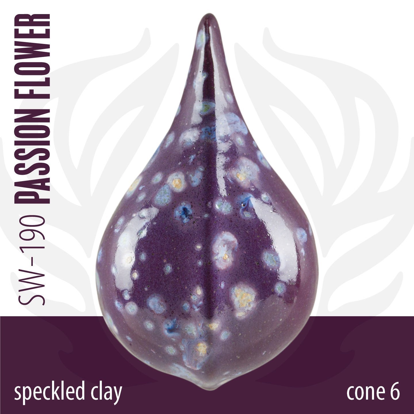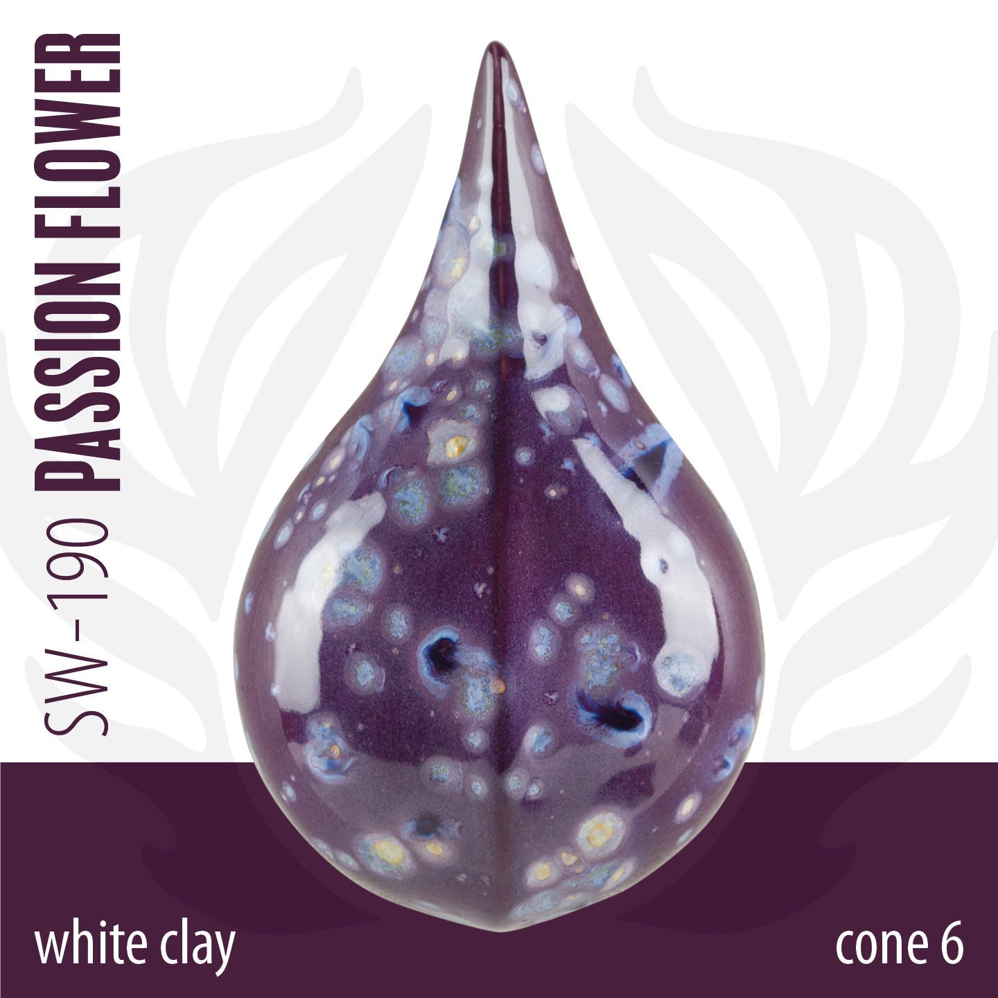 Cone 6 Oksidasyon 1222°C (ilk görsel): Passionflower Flower, parlak, opak, koyu mor bir sırdır ve çeşitli boyutlardaki opak kristaller mavi, yeşil ve sarı tonlarında açılarak çiçeksi bir görünüm oluşturur.