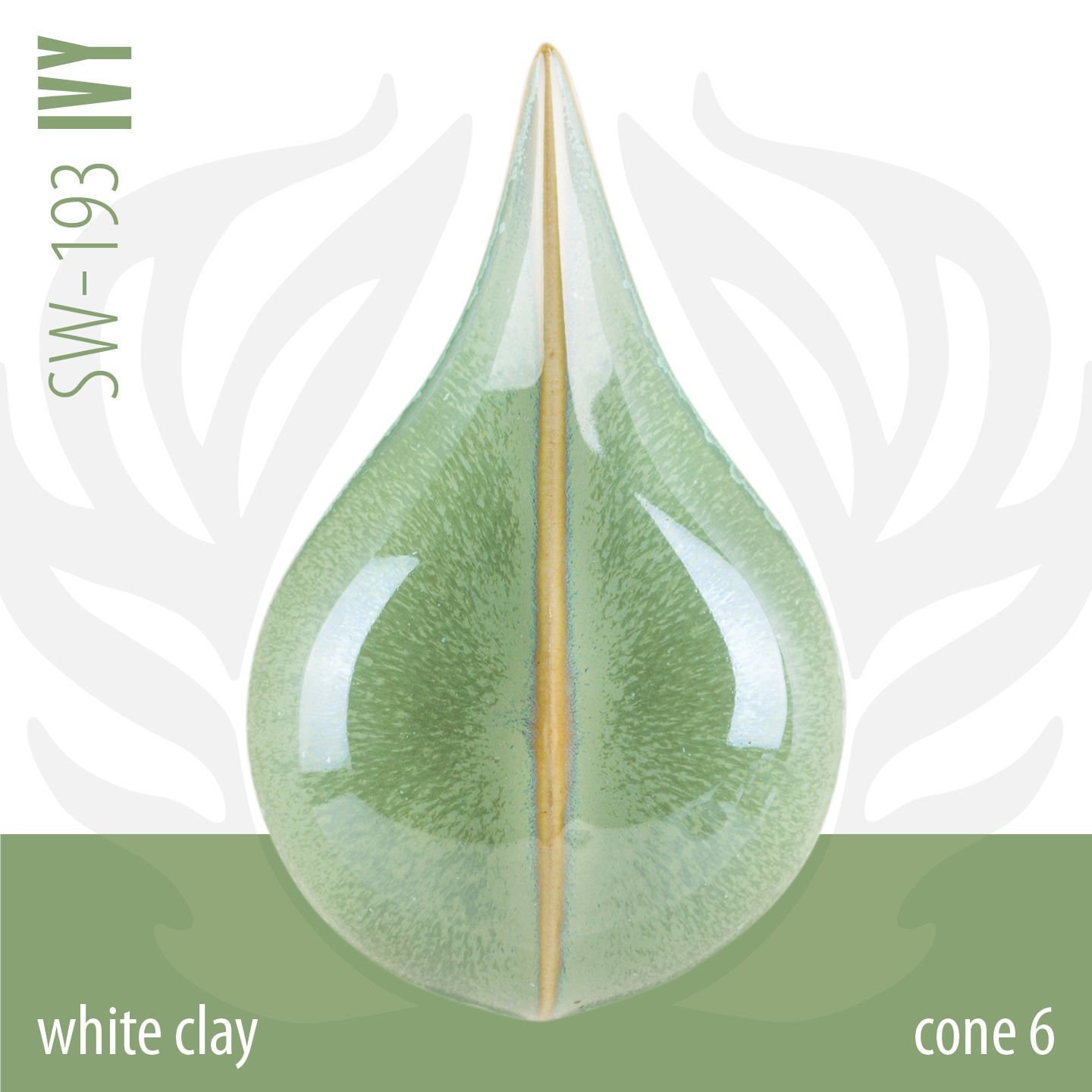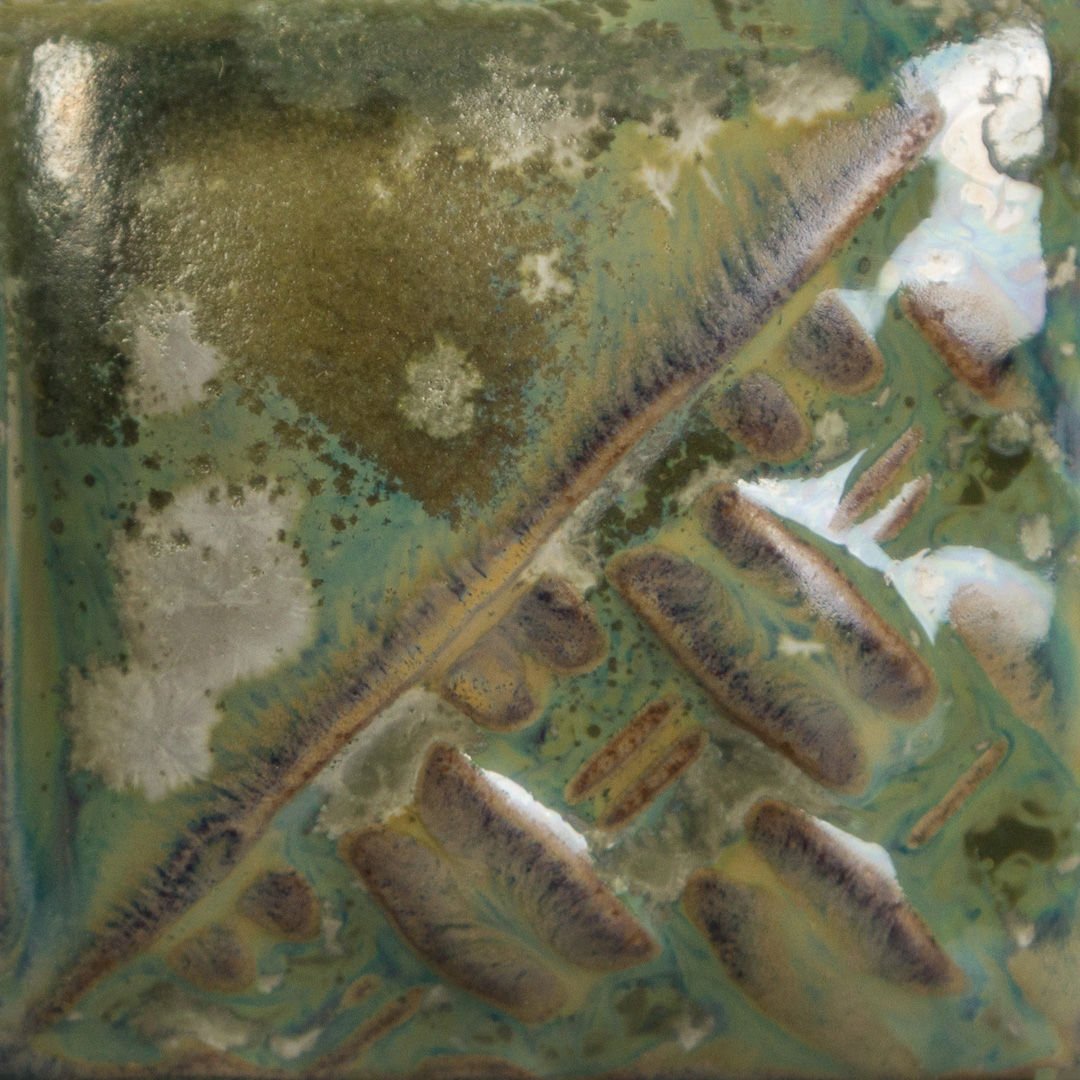 Cone 6 Oksidasyon 1222°C (ilk görsel): Ivy, dokular üzerinde kırılan ve iridesan (ışıltılı) bir parlaklık gösteren, opak ve değişken tonlara sahip yeşil bir sırdır. Yeşil mikro-kristallenme gelişebilir.